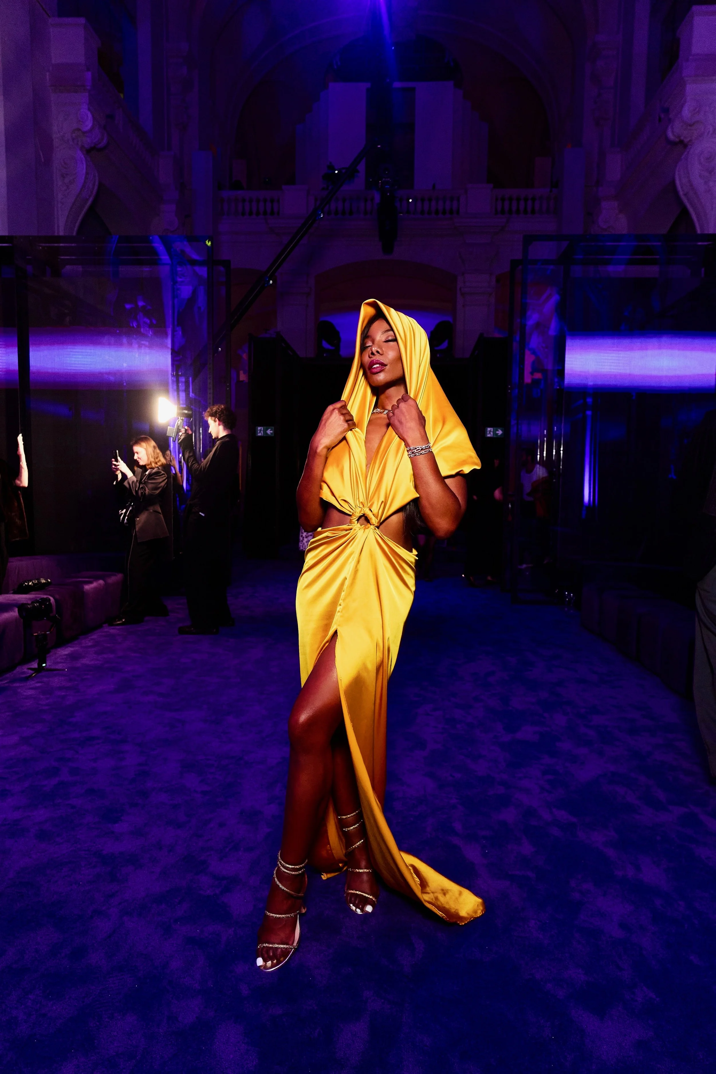 20H35: Entre la pluie, les Flashs, elle passe en guest VIP saluant entre flash et photo call ses Guests et clients "EXCLUSIVE". Elle croise Cindy Bruna qui a adoré la robe, une vraie sonorité entre les deux femmes. Elle poursuit remercimant la directrice Messika et la responsable publique Messika.